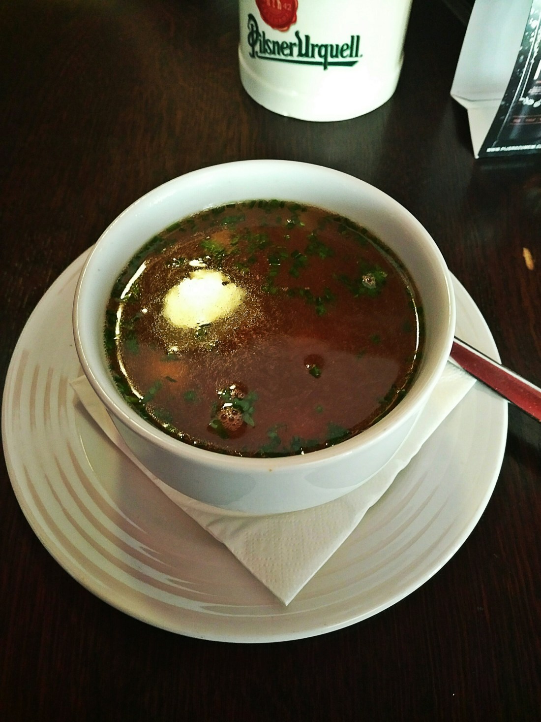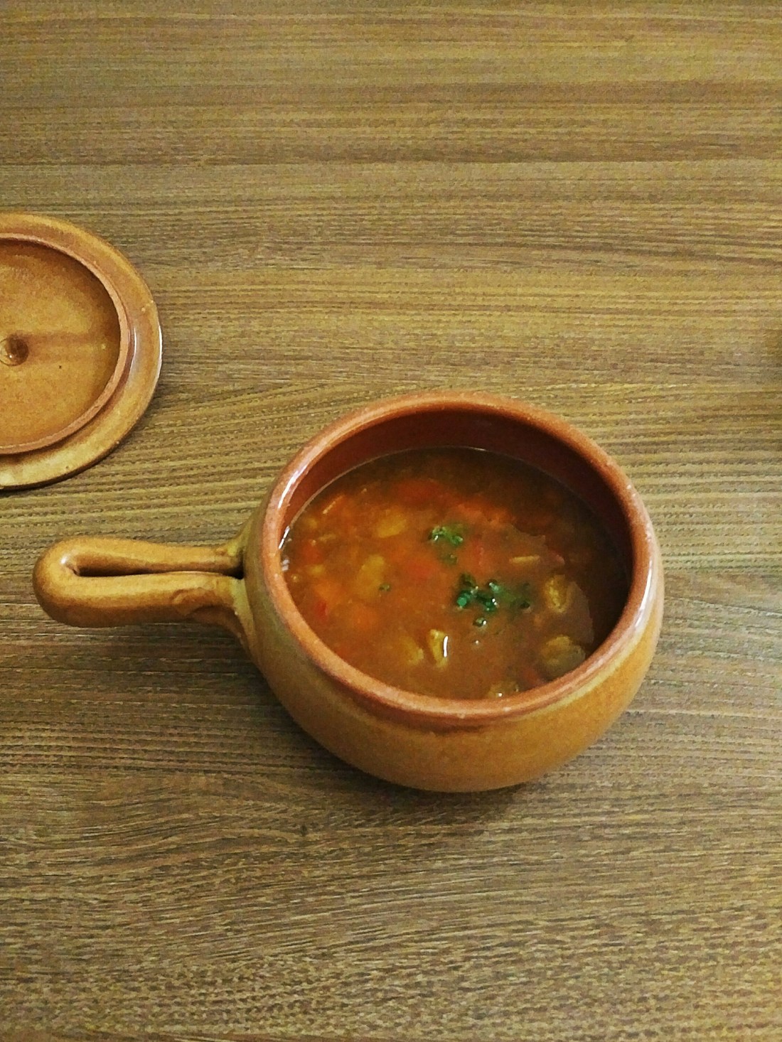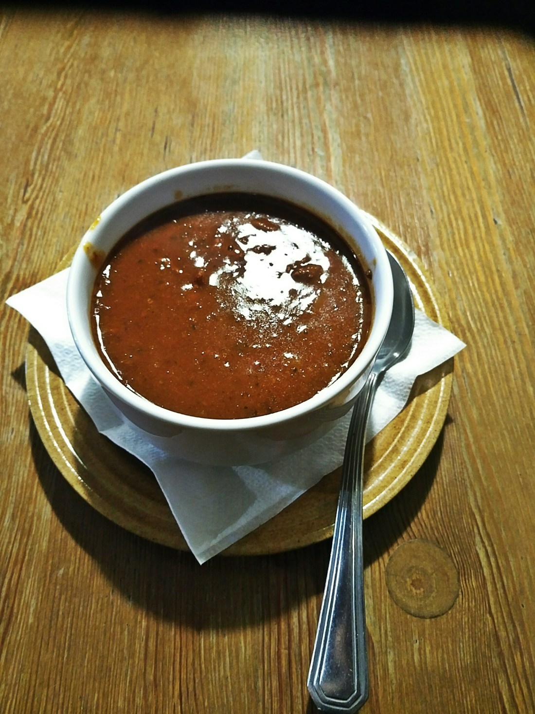 В первую очередь, в этом супе очень много овощей: цукини, морковь, болгарский перец. Все присыпано петрушкой. Говяжье мясо есть, но оно не тушёное, а варёное. Бульон имеет насыщенный вкус, но он не такой густой, как казался. Суп пахнет также томатами, возможно они стали частью бульона. Суп вкусный, но не совсем гуляшный.